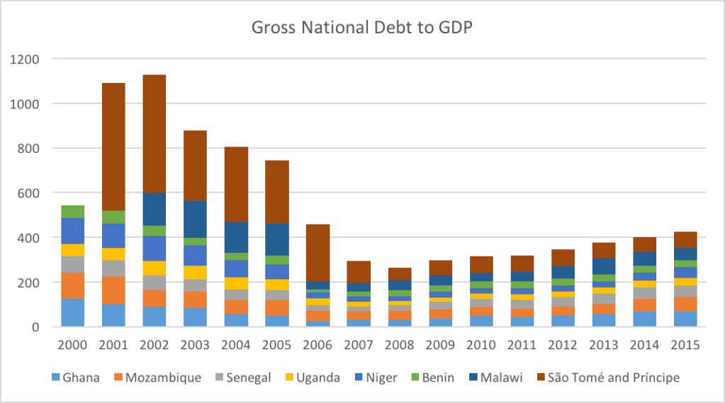 Debt relief for the African countries that reached completion of the HIPC/MDRI initiative by mid 2012 amounted to US$100 billion. Debt to GDP ratio only fell below 30% after these initiatives on the back of strong GDP growth and improved prices on world commodity markets.Debt Sustainability Analysis by the IMF in 2014 however showedthe debt stocks of some beneficiary countries to be on the rise. Of this same report six countries are still in debt crisis of which two (Burundi and DRC) are in Sub-Saharan Africa. A further sixteen encompassing Burkina Faso, Cote d’ Ivoire, Ghana, Guinea, Guinea-Bissau, Malawi, Mali, Togo, Niger, The Gambia, Sierra Leone, Mozambique, Mauritania, and Central African Republic were classified as moderately in debt distress. A separate report by the World Bank notes that a third of the gains made on debt stock ratios since HIPC/MDRI for eight African countries (Niger, Malawi, Ghana, Senegal, Uganda, Mozambique, Benin and Sao Tome and Principe) had been wiped out over a four-year period since their completion of the programme. It warned that if the rate of piling on debt continues, the debt to GDP ratios will soon revert to pre-relief ratios within a decade irrespective of economic growth.